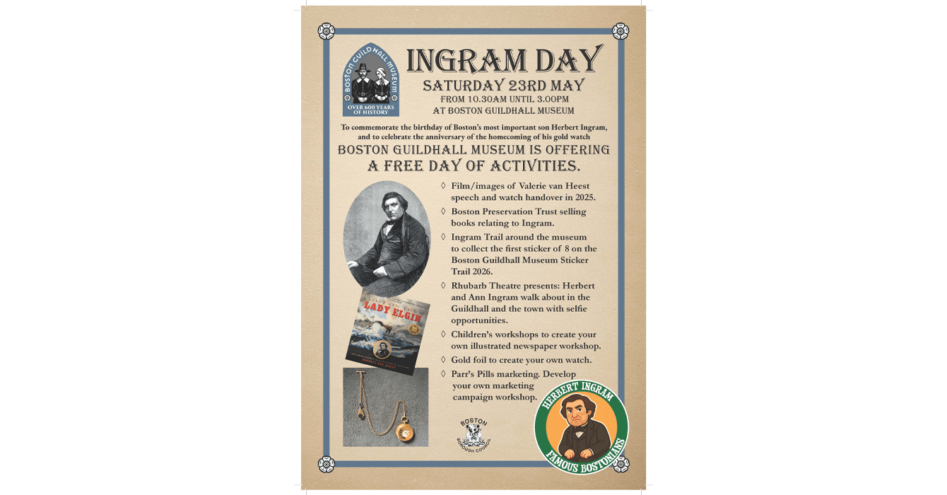 Running from 10.30am to 3pm, Ingram Day will also mark the anniversary of the return of Herbert Ingram’s gold watch to Boston, following its homecoming to the town. The event will offer residents and visitors the chance to learn more about Ingram’s legacy through a programme of engaging and family‑friendly activities.
