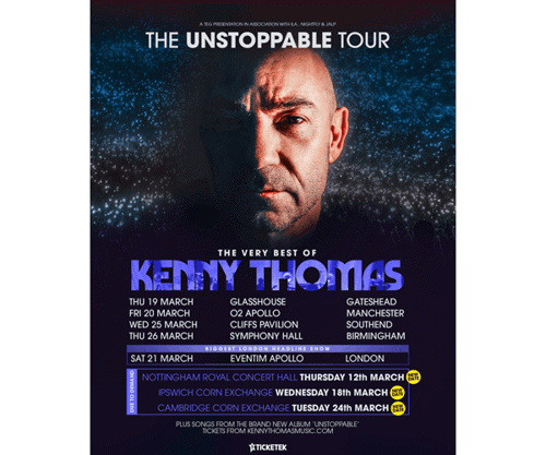 ‘The Unstoppable Tour: The Very Best of Kenny Thomas’ will begin at the Glasshouse in Gateshead on 19 March, before travelling onto Manchester, the London Eventim Apollo for what will be Kenny’s biggest ever headline show, and Southend, before its finale at Birmingham Symphony Hall.